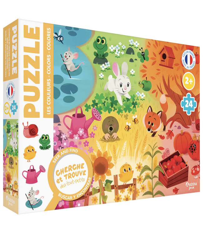 Un magnifique puzzle de 20 pièces sur les couleurs, pour les petits, fabriqué en France !Le puzzle cherche et trouve est une déclinaison de la collection phare Cherche et trouve des petits.Avec un poster : au recto, la belle illustration ; au verso, les éléments à cherche et retrouver dans le puzzle !âge : 2 ans20 piècesThème : les couleurs
