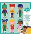 L’enfant s’amuse à habiller 6 personnages (3 garçons, 3 filles) avec de la feutrine autocollante. Ensuite, il est temps de mettre de la couleur grâce aux stickers et aux strass.