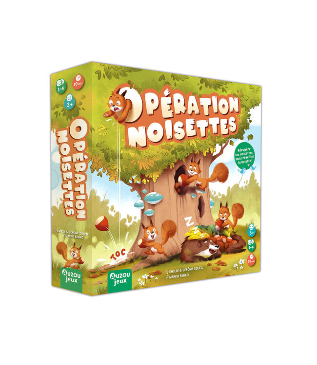 Oh non, l’hiver arrive et la belette a volé toutes les noisettes des écureuils avant de s’endormir au pied de l’arbre ! Aide vite les écureuils à récupérer toute leur réserve, mais attention, la belette ne dort que d’un seul œil ! Arriverez-vous à remettre toutes les noisettes dans l’arbre sans la réveiller ?Contenu : 1 arbre à assembler / 1 belette / 20 noisettes en bois / 4 oiseaux en bois / 10 feuilles en carton / 1 dé en bois / 1 sac en tissu