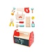 - Inclus 11 accessoires: un sac en tissu, une scie, une pince, un tournevis, une planche en bois avec deux trous, deux clous, un boulon, une vis, un petit « pot de colle », un marteau et un tableau de craie (craie non incluse)